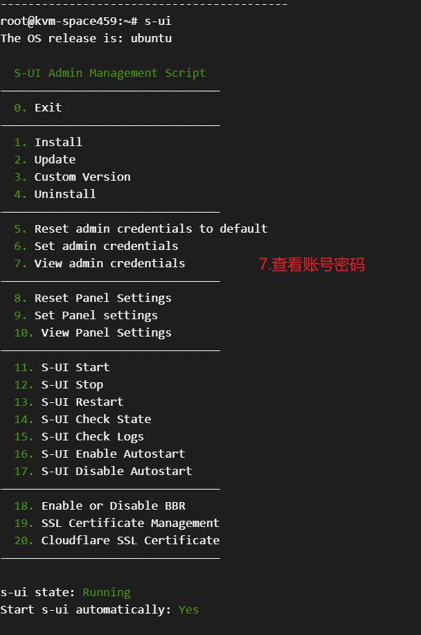 安装完成后,输入 s-ui 就能看到管理面板,如下图片所示,可以重新查看面板信息